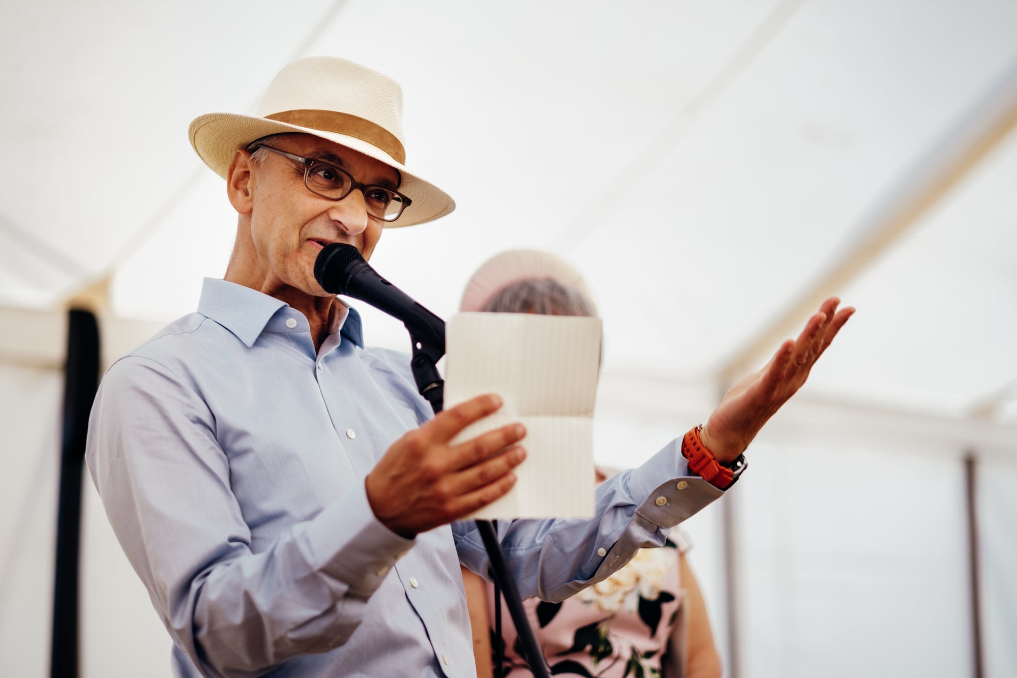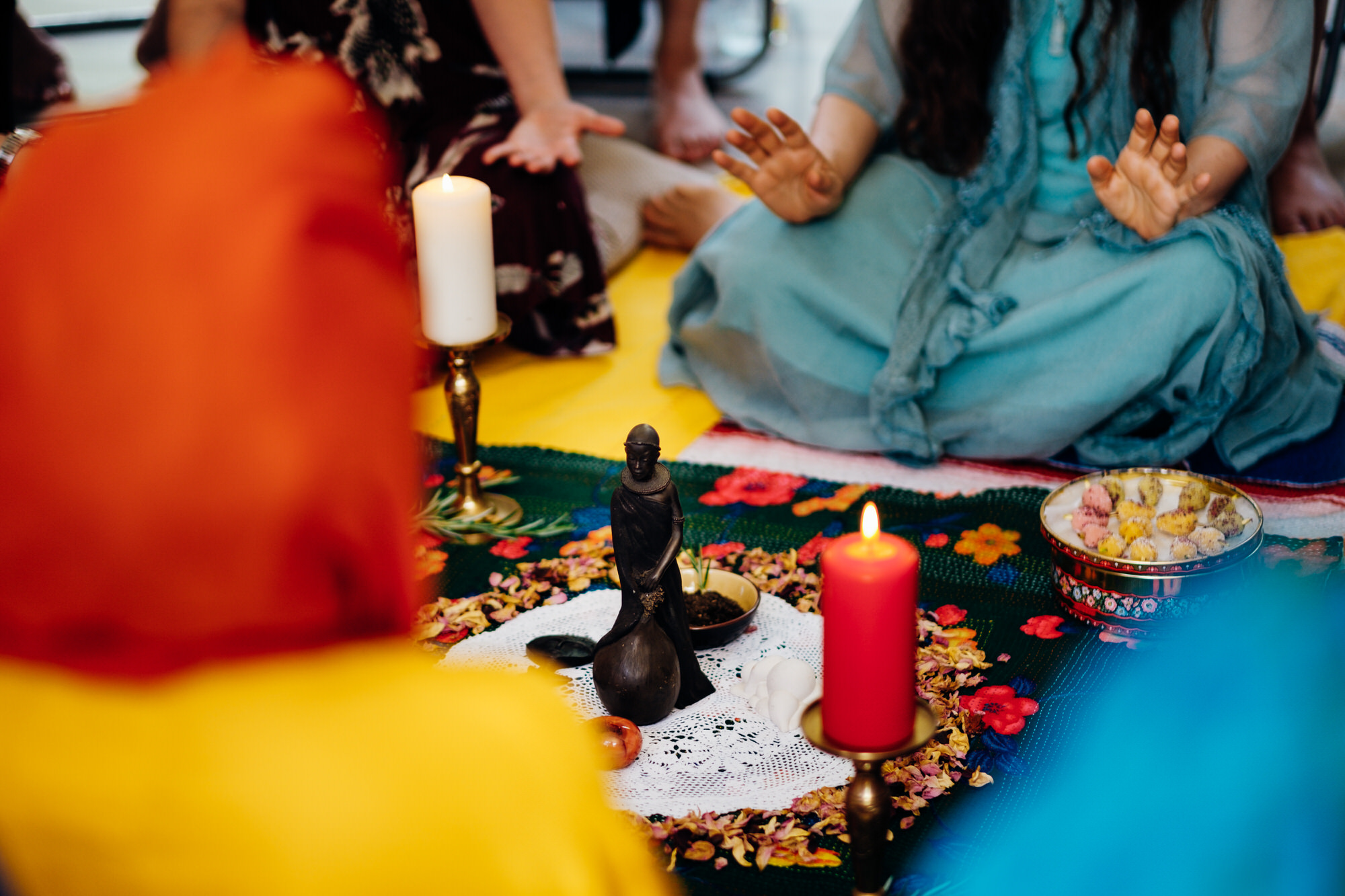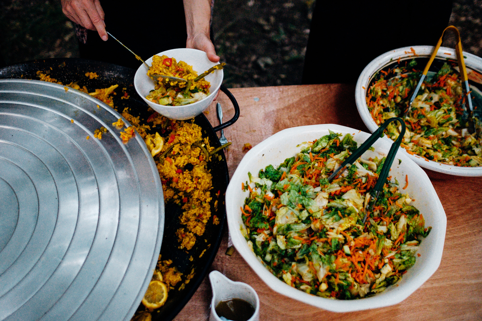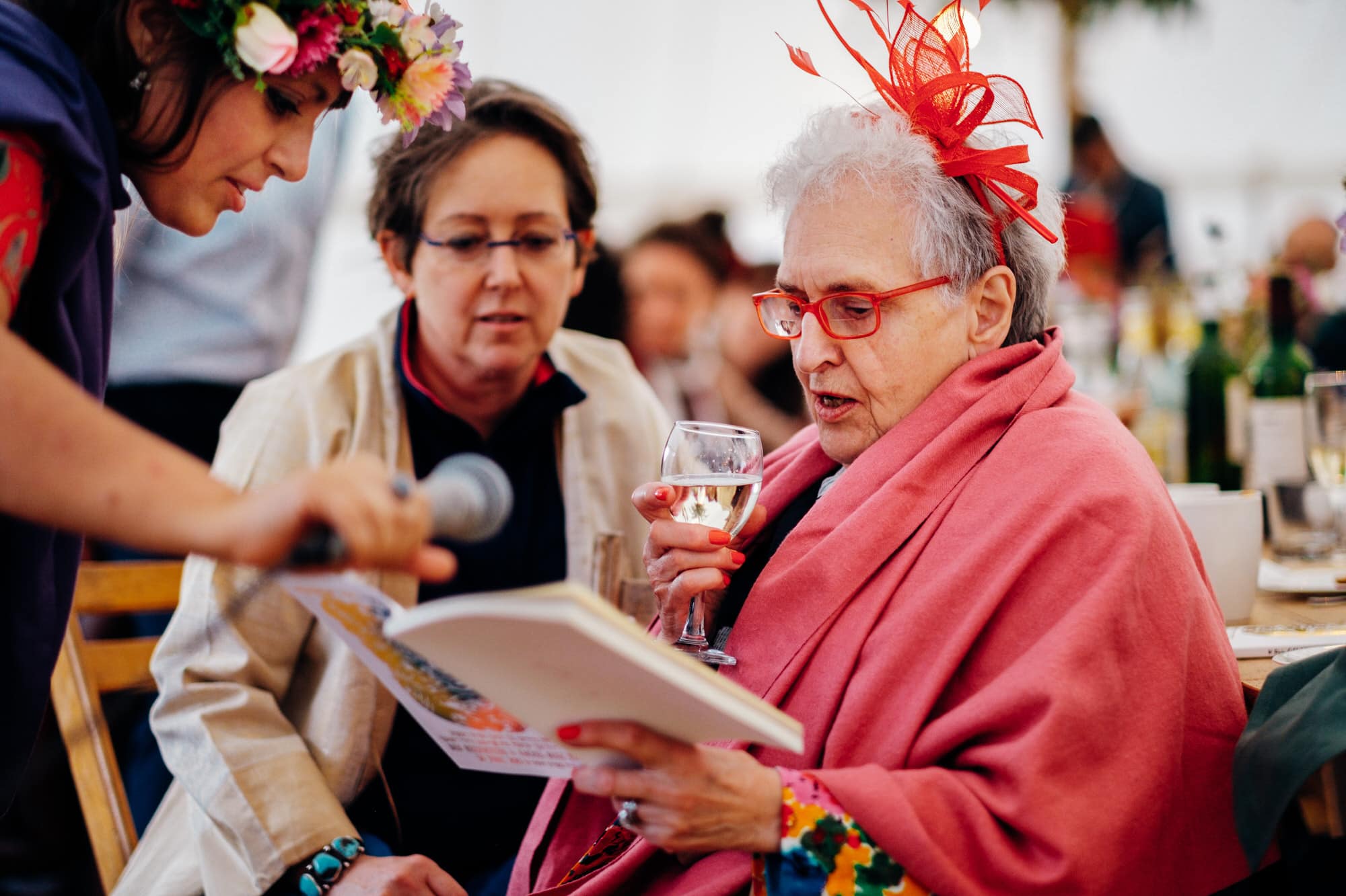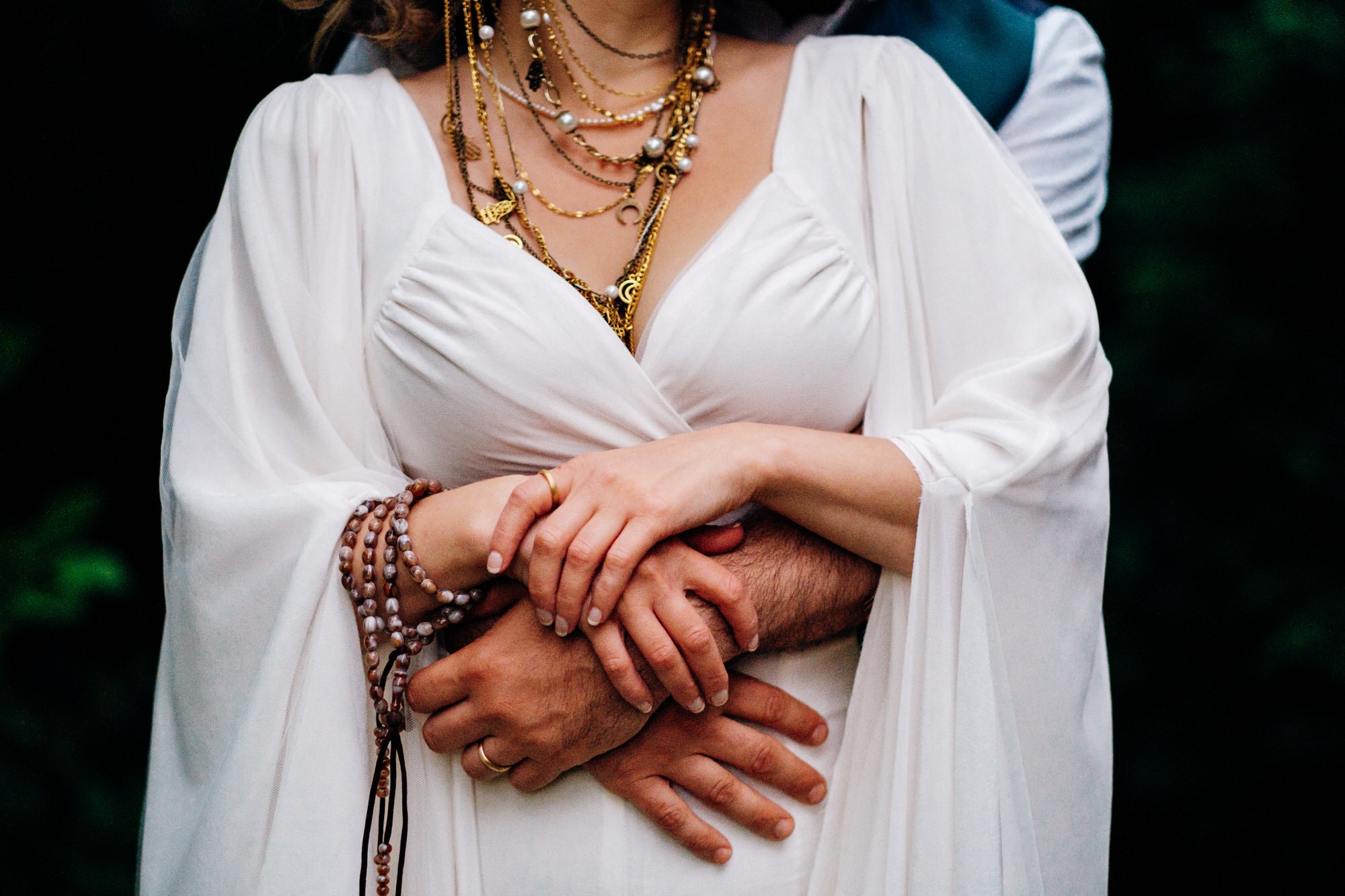 Ben wore a brilliant dark teal suit whilst Rachel wore a white jumpsuit made by a friend and epic golden headdress decorated with moons and hamsas, inspired by traditional Jewish headdress and custom made by Isla Campbell. Their ceremony consisted on many unique touches. They used an “entwine mobile” to take family to the ceremonial tree, they were led in a song and dance processional to meet the couple half way up the path to all continue to the outdoor ceremony space. When they met half way along the path, Rachel wore a ceremonial garment which guests has tied prayers to beforehand. The ceremony itself took place under a gorgeous Chuppah created amongst the tree itself, and the couple did several Jewish wedding traditions such as smashing the glass, reading the ketubah and circling each other.