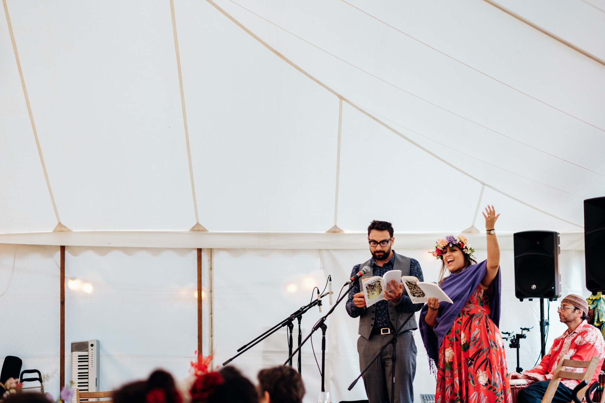 All of their amazing food was vegan and sourced ethically and their cake was decorated with chocolate hedgehogs by friends, between the courses they had speeches from both sets of parents, followed by two rounds of open mic cabaret from their super talented friends.